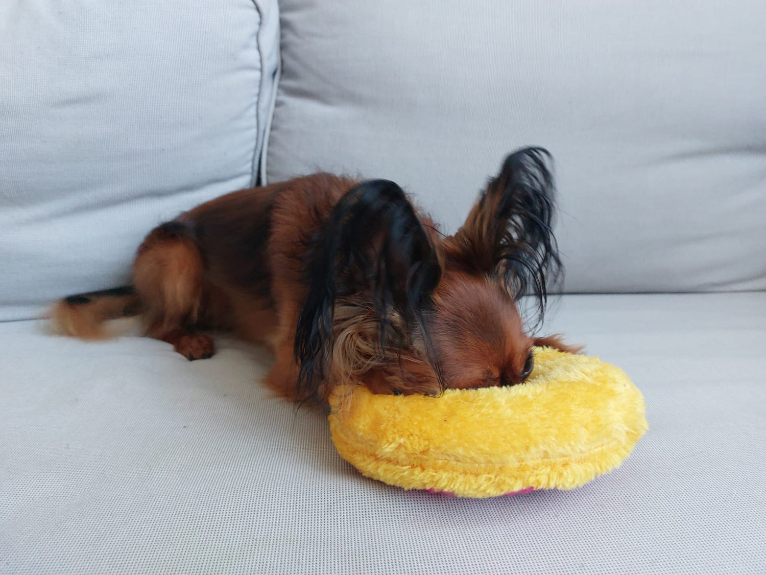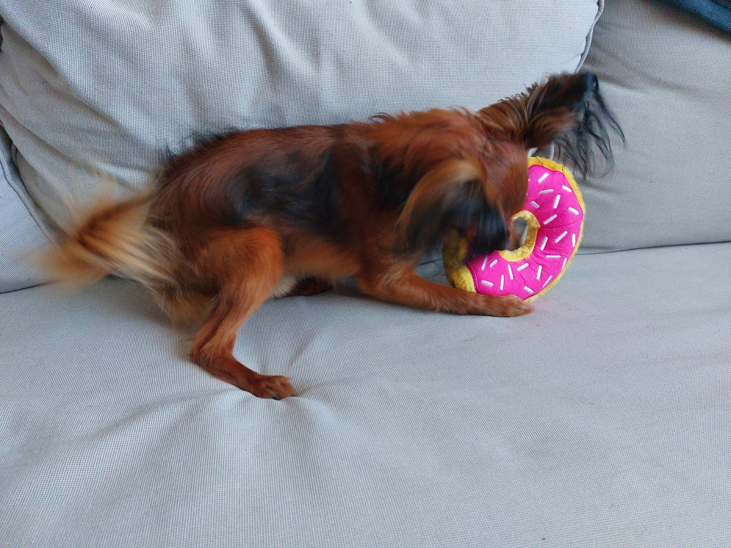 Cette peluche en forme de donut (18 cm) avec squeaker intégré (aussi appelé pouet-pouet) coche toutes les cases :